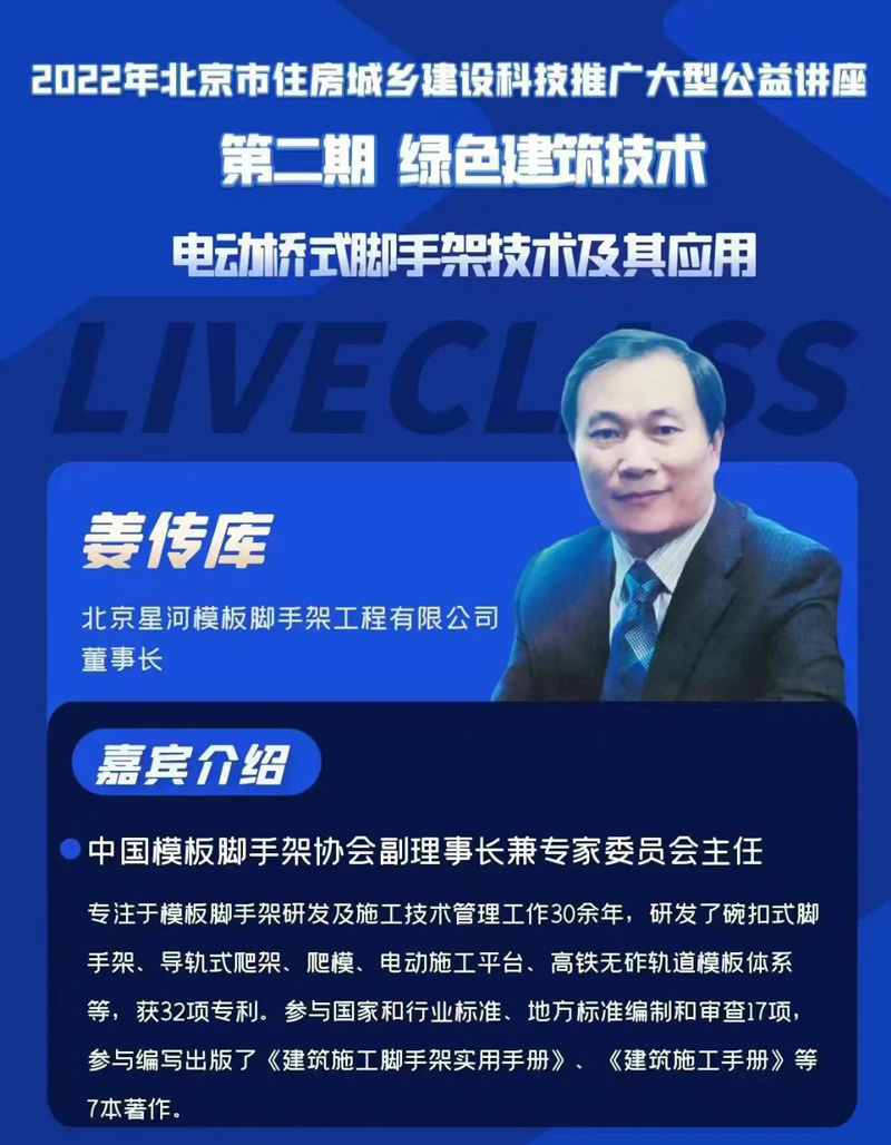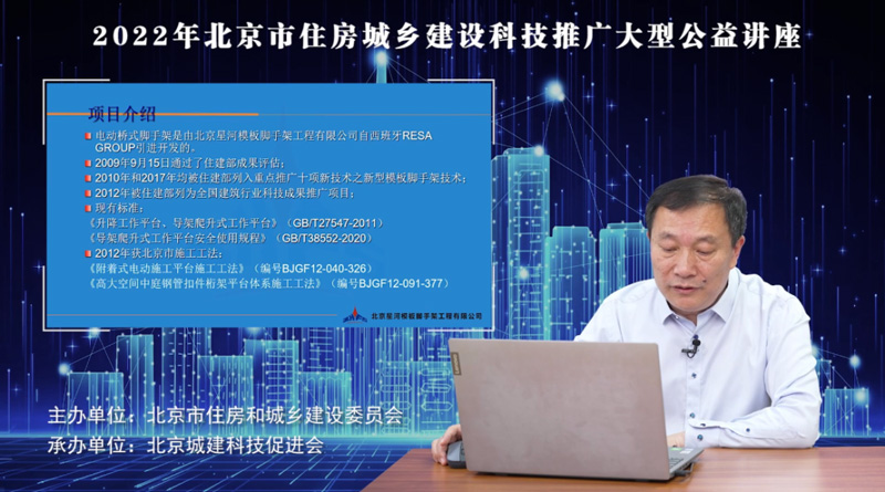 協(xié)會(huì)副理事長兼專家委員會(huì)主任、北京星河模架工程有限公司董事長姜傳庫,近日做客2022年北京市住房城鄉(xiāng)建設(shè)科技推廣大型公益講座,主講《電動(dòng)橋式腳手架技術(shù)及其應(yīng)用》。